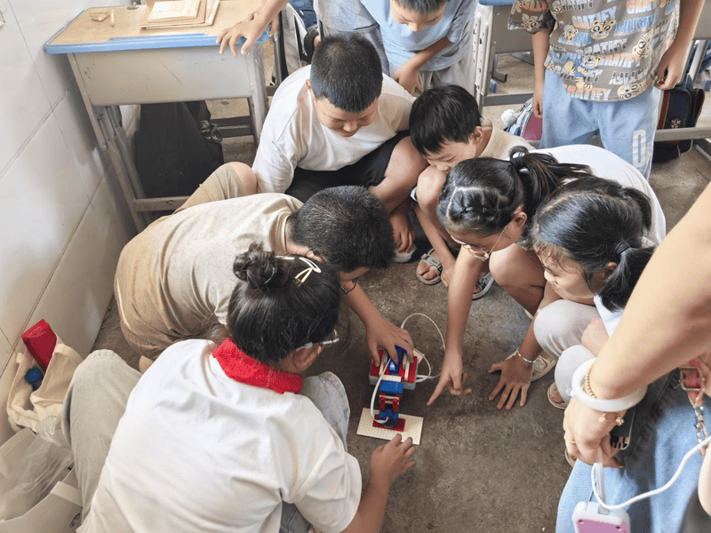 在手工拼裝與編程體驗(yàn)環(huán)節(jié),叮叮老師帶來了“掃地機(jī)器人”的搭建材料,開啟同學(xué)們的“科技創(chuàng)作之旅”。她巧妙比喻編程的核心邏輯,就是給機(jī)器人寫“指令信”,并現(xiàn)場通過線路連接和編程刷卡等操作,讓機(jī)器人根據(jù)指令“動(dòng)起來”。隨后,同學(xué)們以小組為單位投入創(chuàng)作,跟著老師完成搭建及指令的輸入,個(gè)性化的外觀搭建讓機(jī)器人“活力滿滿”。在親手實(shí)踐中真切感受AI技術(shù)的樂趣與價(jià)值,對科技知識(shí)的理解也更深刻了!